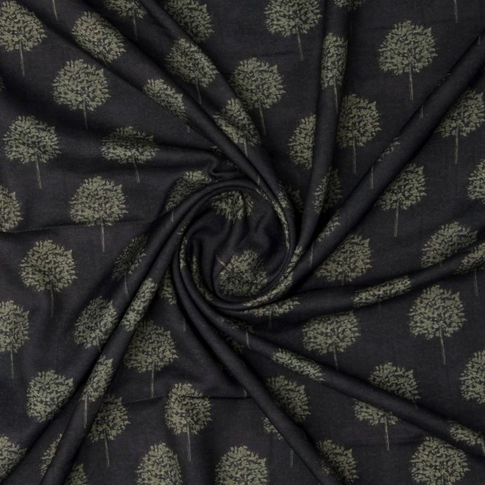 Charcoal Black & Olive Green Tree Printed Rayon Fabric