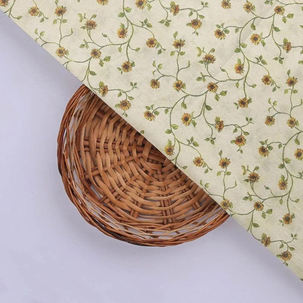 Embrace a touch of rustic elegance with this beautiful Tusser Silk fabric from FAB VOGUE Studio. Set against a serene cream background, a delicate digital print of vining sunflowers unfolds in cheerful yellow and earthy brown tones, with soft green leaves creating a continuous, charming trail. The fabric's lightweight nature, at just 80 GSM, gives it a wonderful, fluid drape that is perfect for designing graceful apparel. Imagine crafting stunning maxi dresses, elegant kurtas, summery blouses, or even a complete saree that flows with every movement. The ditsy floral pattern is timeless and versatile, making it a superb choice for women's and children's wear. Beyond clothing, its gentle aesthetic can transform your living space. Use it to create airy curtains that filter sunlight beautifully, or to sew delightful cushion covers and table linen that bring a cottage-core vibe to your home. This fabric is a splendid canvas for your creative expressions.