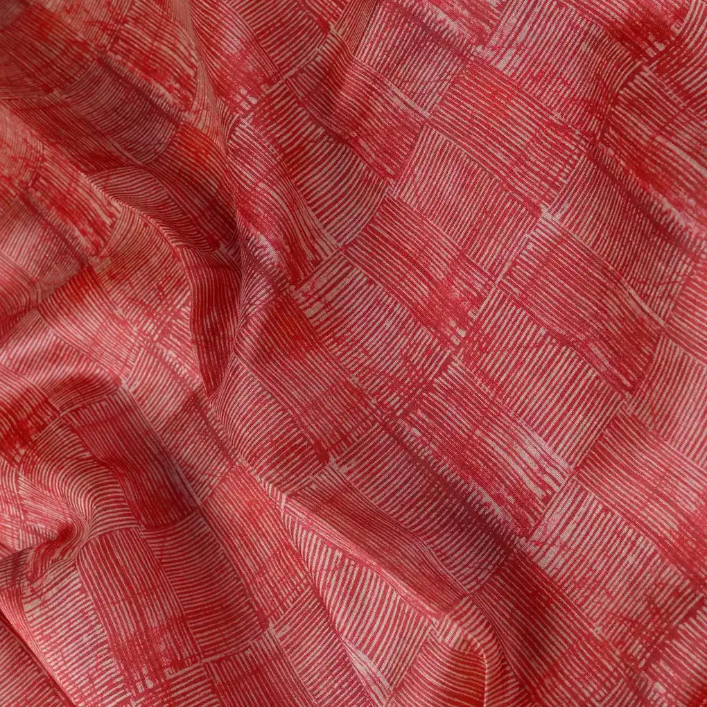 Checkes Textured Red And White Digital Printed Fabric - Tusser Silk