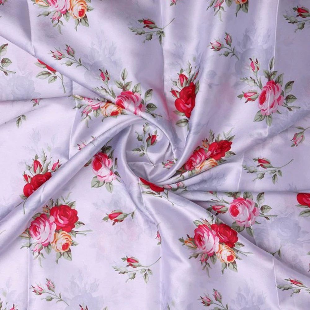 Embrace timeless romance with this exquisite floral fabric from FAB VOGUE Studio. Printed on luxurious Japan Satin, this design features clusters of blooming roses in vibrant shades of red and delicate pink, artfully scattered across a serene lavender background. Subtle, shadowy floral silhouettes add a layer of depth and sophistication to the pattern. The fabric itself is a delight to the senses, boasting a signature glossy sheen and an incredibly smooth, fluid drape that flows gracefully. At a lightweight 100 GSM, it feels soft and comfortable against the skin, making it an excellent choice for creating stunning apparel. Fashion beautiful maxi dresses, elegant sarees, chic blouses, contemporary kurtas, or flowy skirts. Beyond clothing, its versatility extends to bespoke home furnishings like decorative cushion covers, sophisticated table linens, or even as an accent for light curtains, bringing a touch of botanical charm to any space.