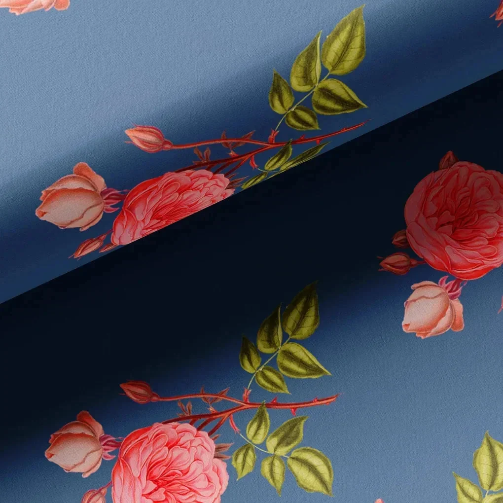 Red Rose Laying Over Blue Base Digital Printed Fabric