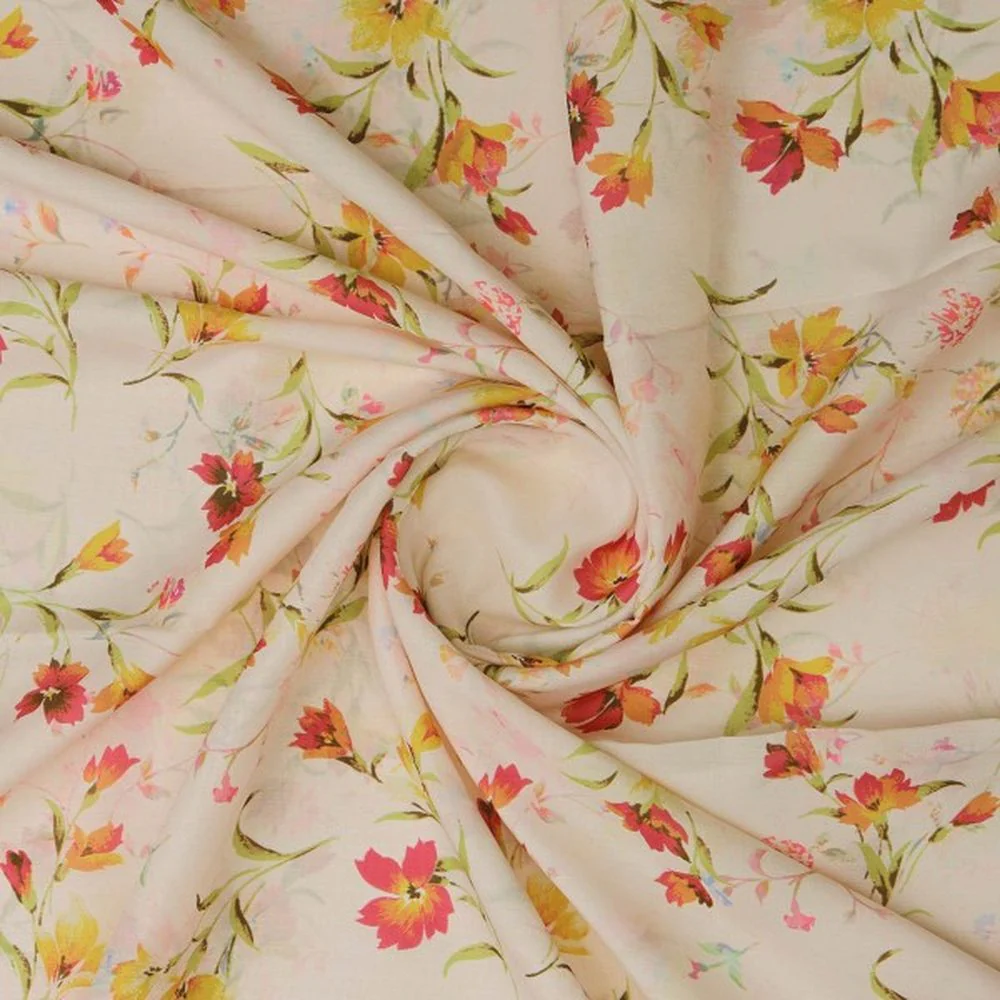 Embrace the beauty of a summer garden with this exquisite muslin fabric from FAB VOGUE Studio. Set against a serene cream backdrop, a delicate watercolour-style floral print blossoms in vibrant shades of red, yellow, orange, and soft pinks, intertwined with fresh green leaves. This lightweight fabric, weighing just 80 GSM, is crafted from fine muslin, renowned for its soft touch, subtle lustre, and graceful drape. Its airy quality makes it a perfect choice for warm-weather apparel like flowing maxi dresses, elegant anarkalis, comfortable kurtas, chic tops, and diaphanous sarees. Beyond fashion, its versatility extends to home decor; imagine sheer curtains that gently filter sunlight or charming cushion covers that add a touch of romance to your space. This digitally printed fabric is also a delight for crafters looking to create unique bags, accessories, or quilting projects.