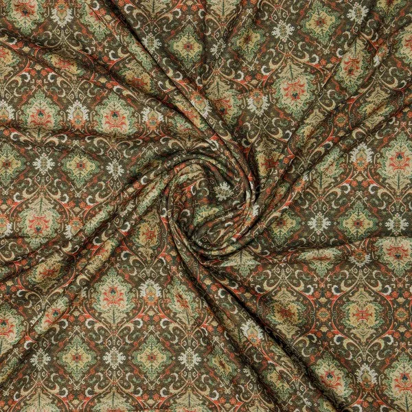 Immerse yourself in timeless elegance with this exquisite printed rayon fabric from FAB VOGUE Studio. The design features an intricate Damask and Ogee pattern, rendered in a sophisticated, earthy palette. A deep brown base provides a rich canvas for motifs in muted sage green, rustic orange, and delicate cream, creating a vintage-inspired aesthetic reminiscent of classic tapestries. Crafted from soft, lightweight rayon, this fabric boasts a wonderfully fluid drape and a smooth, comfortable hand-feel against the skin. It is the perfect choice for creating stunning apparel such as flowing maxi dresses, elegant kurtas, chic blouses, and stylish skirts. Its versatile nature also extends to home decor, where it can be transformed into luxurious cushion covers, statement curtains, or elegant table linens, adding a touch of traditional charm to any space. Unleash your creativity with this beautiful and adaptable fabric.