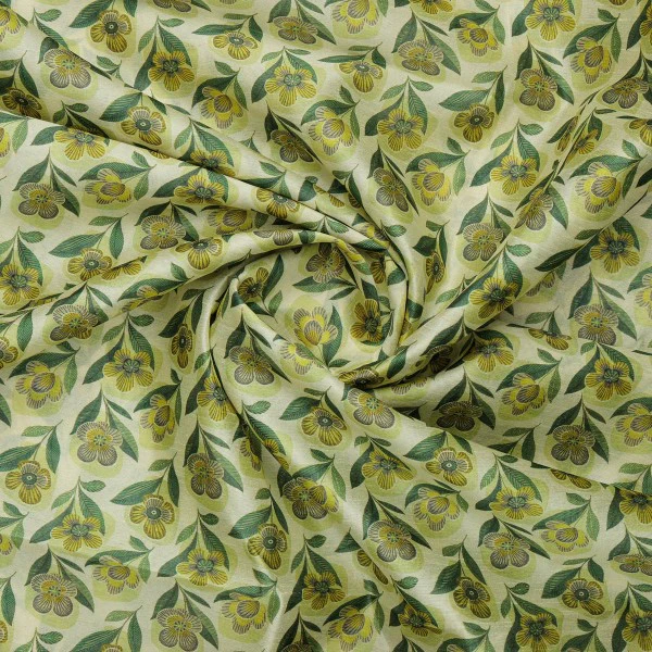 Yellow & Green Retro Floral Tusser Silk Fabric for Kurtis